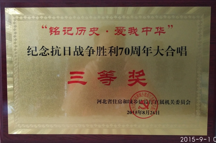 2015年8月26日,嘉聯(lián)集團參加由河北省住房和城鄉(xiāng)建設(shè)廳直屬機關(guān)委員會主辦的“銘記歷史 愛我中華”紀念抗日戰(zhàn)爭勝利70周年合唱歌曲比賽,榮獲集體“三等獎”。
