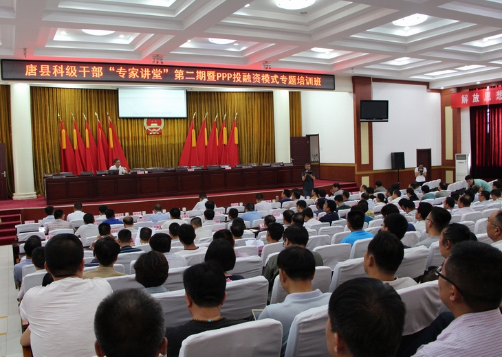 6月16日,保定市唐縣縣委、縣政府組織召開“唐縣科級干部專家講堂第二期暨PPP投融資模式專題培訓(xùn)班”。河北省城市建設(shè)投融資協(xié)會會長、國家財政部PPP專家?guī)烊霂鞂<夷掠⒘质苎麨榕嘤?xùn)班授課。